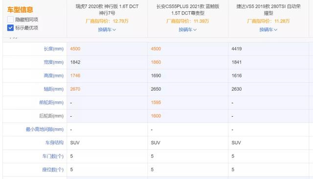在车身尺寸上,最小的是捷达VS5,车身长度4419mm,轴距2630mm;其次是长安CS55 PLUS,车身长度4500mm,轴距2650mm;最大的是全新一代瑞虎7神行版,车身长度与CS55 PLUS一致,都为4500mm,但轴距略长一点,是2670mm。