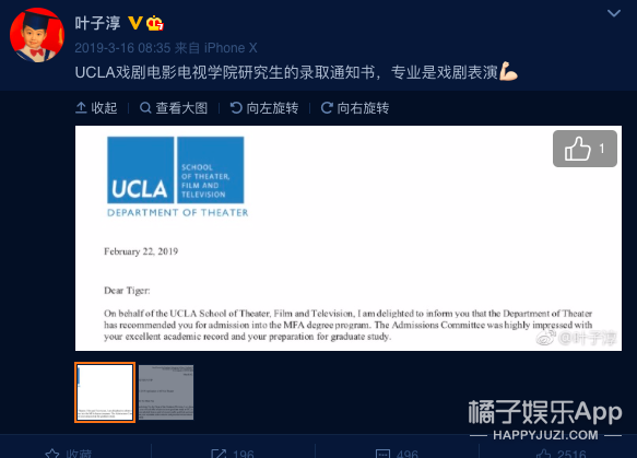 他被美国加州大学洛杉矶分校戏剧电影电视学院的研究生录取▼