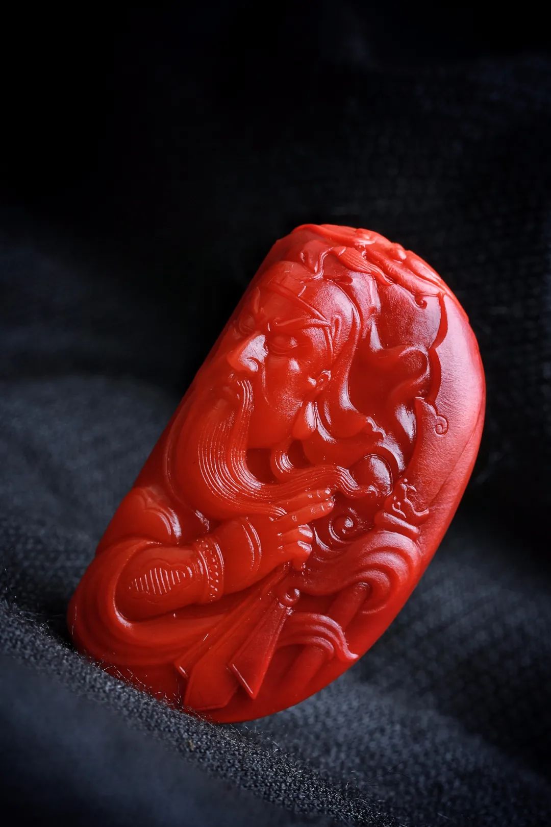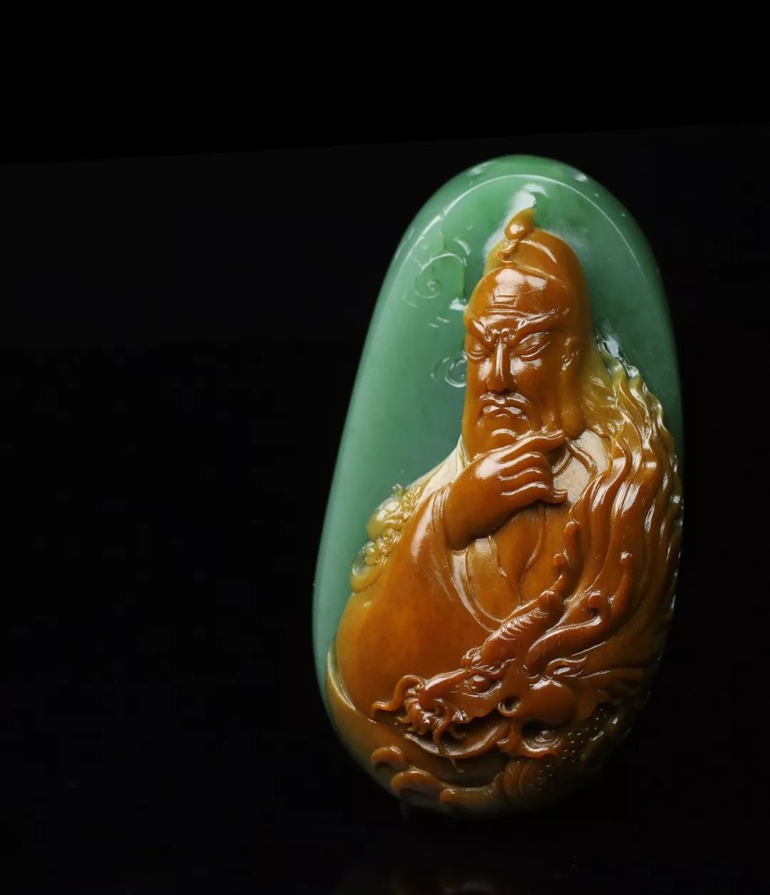 关羽的人格魅力和忠义精神被佛、道、儒三教所崇信,有“武王”、“武圣人”之尊,后世对他的追封不断,关公这一形象为民众所喜爱,并被众多的玉雕艺术家运用,其形象多见于浓眉闭目,胡须飘逸,气宇轩昂。