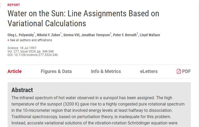 再来看看最后一个问题,《Science》真的刊载过太阳上发现水的论文吗?事实上,确实有这两篇论文的存在,但文中根本没有直接表示发现水的痕迹,只是说从太阳黑子的红外光谱中,发现了一些和水非常像的吸收特征谱线。