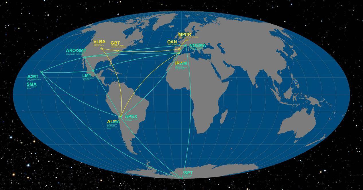 图解:此信息图详细说明了视界望远镜(EHT)和全球mm-VLBI阵列(GMVA)的参与望远镜的位置。他们的目标是第一次成像银河系中心超大质量黑洞事件视界的阴影,并研究银河系中心附近积聚和流出的性质。 图源:Wikipedia