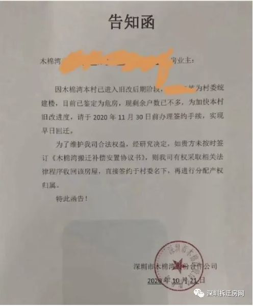 据自媒体爆料,京基木棉湾旧改木棉湾股份公司发出告知函,未在2020年11月30日前签约,将采取法律程序收回房屋,签约至村委名下,再进行分配!
