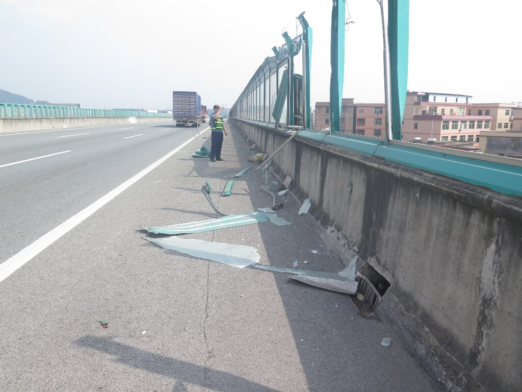 路政人员立即将现场情况告知监控中心,并通知监控中心通过监控录像寻找肇事车辆。随后路政人员对现场进行勘查,事故共损坏6块正方形钢化玻璃、7根立柱、8块声屏障板铝板、2块下罩板和9块上罩板,路产损失严重。养护单位迅速拆除了受损设施,及时消除了安全隐患。