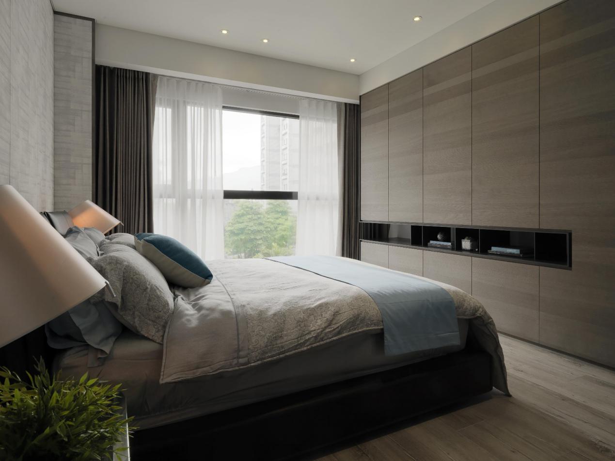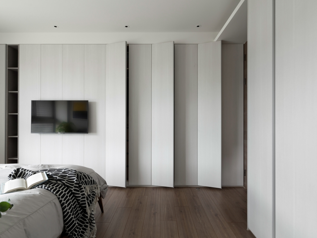 大型的衣柜,适合采用较为简约低调的设计,与整体的装修风格、墙面形成和谐的视觉效果,减轻空间的杂乱感,让卧室看起来更加通透。