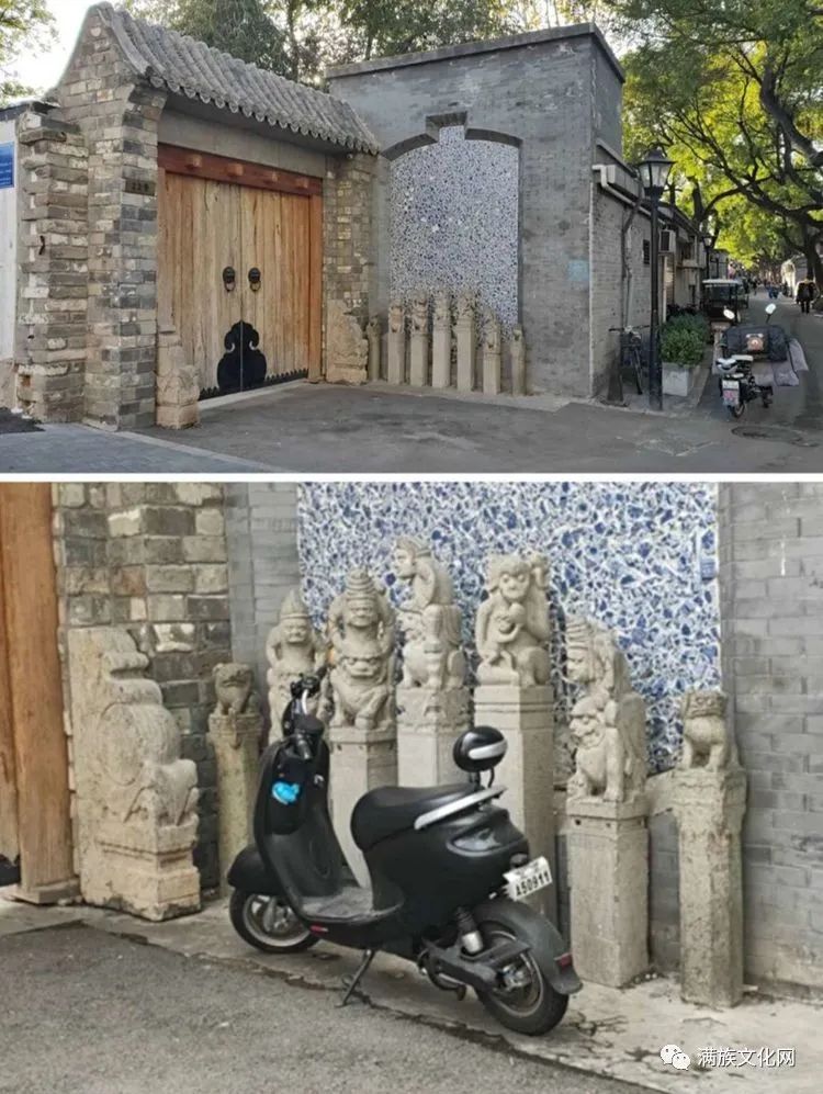 这家儿更有意思,大门看不出是什么规格,贴了一墙的青花瓷片,下面的石柱子挨着墙站成了一排,马桩上栓了一辆电驴子,这个坐骑看着很眼熟,即便不栓它自个儿也跑不了……忽然想起了小区里的地锁,有车的都怕被别人抢了地盘儿,所以都要跑马占地……莫非这些个拴马桩…是专门给电驴子预备的……谁能给总结一下这算是什么风格?