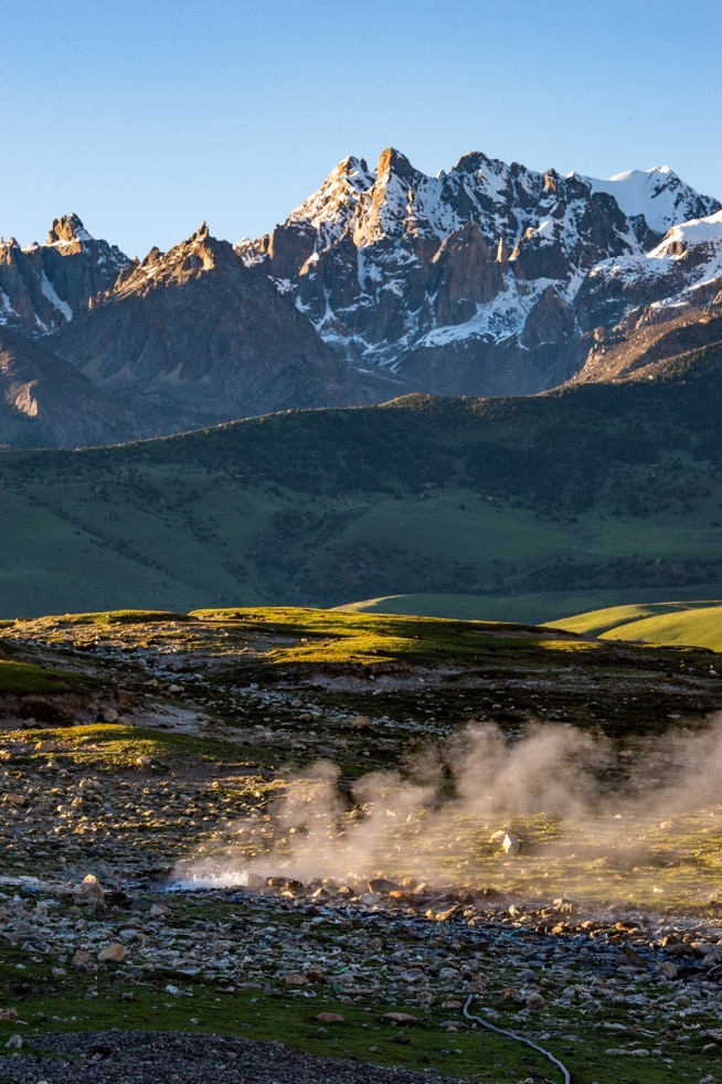 措普沟热坑温泉群是四川省境内最大的地热温泉群,或是公路旁、或是山间、或是森林、亦或是湍急的河流边,都能看到大大小小的温泉,如果是清晨或者傍晚来到这里,还能看到山谷里到处都升腾着一股股热气,运气好时,或许能遇到清晨放牧的牧民,从云雾中走出,彷佛是一个从仙境走出来的仙翁。