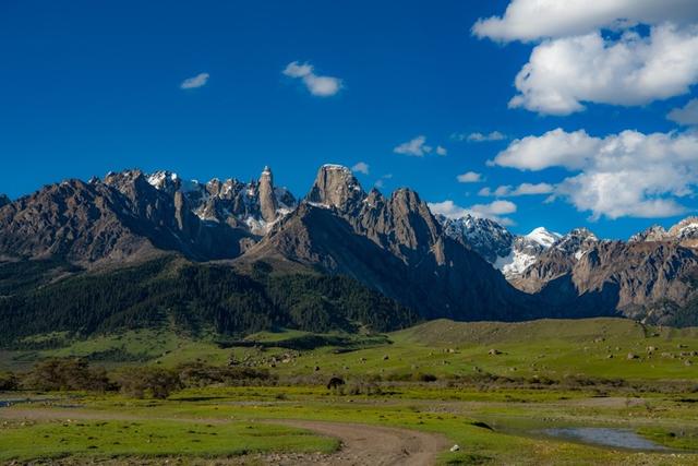 穿过美丽的河谷之后,便可到达章德大草原,一个弯道之后,神山扎金甲博赫然出现在眼前,高耸入云的山峰,整齐的排列在章德草原之上,像一把把利刃,又像一座座壁垒,更像极了托尔金笔下《魔戒》中的中土世界的魔山,而章德草原在雪山的环拥下,像一副碧绿的画卷,牛羊在草地上悠然自得的漫步,牧民的帐篷和木屋升起的袅袅炊烟,青藏高原独有的高山草甸上星星点点着各类的鲜花,映衬着湛蓝的天空与蜿蜒的河水,仿佛天堂一般。如果说扎金甲博是一个面庞冷峻的男子站在天地之中,那章德草原就如同一个柔情似水的女子依偎在怀里,孕育了这一方生命。