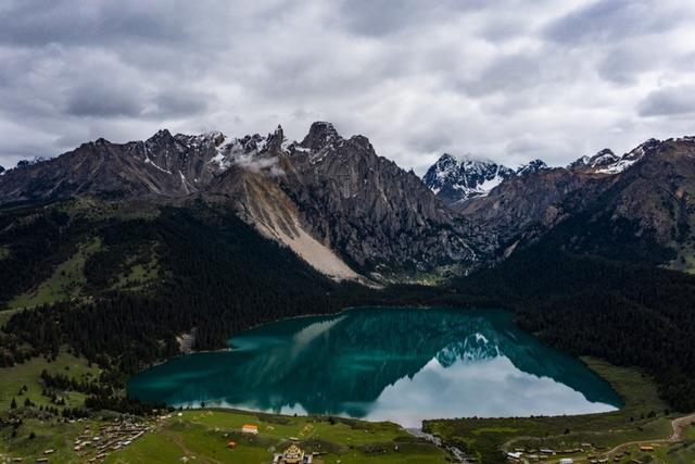 继续往前,穿过章德大草原,一路上听着草地与清风低喃,跨过小溪,路上零星的坐落着一些当地人的民居。不远处,便是康巴第一圣湖—措普湖。如绿松石般碧绿的措普湖面向辽阔的章德大草原,另外三面是杉柏森森的原始森林与扎金甲博神山,身旁环抱了神山与草原、森林的措普湖,这也让她有别于其他高原海子,无愧康巴第一圣湖的美称。