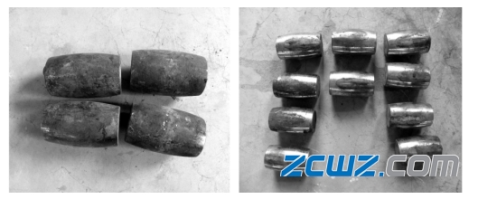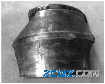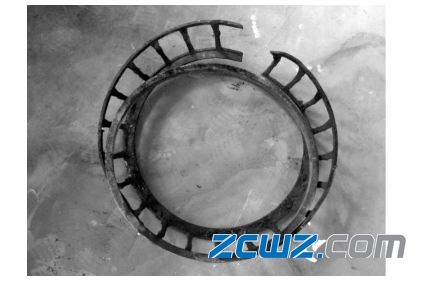 此调心滚子轴承在运转过程中导致严重损坏,内圈表面严重烧伤,最终导致轴承失效,无法使用。图1为此轴承的整体外圈,图2为此轴承内圈碎片及轴套外观,图3位此轴承的滚子表面图,图4为此轴承的保持架。