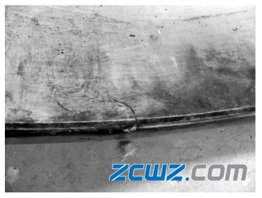 一裂纹从外圈端面延伸至滚道表面( 图 5) ;外圈滚道上运转轨迹发生偏斜,一侧磨痕靠近一端面倒角处,另一侧磨痕距另一侧端面处约30 mm,滚道表面有烧伤现象,如图 6 所示。