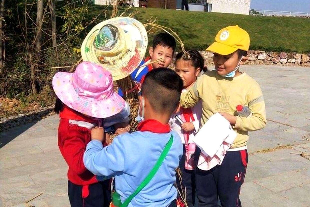 很快,一个个大小不一、形态各异的稻草人就“诞生”了。有的穿着色彩鲜艳的大衣,仿佛马上要翩翩起舞;有的戴着精致的草帽,似乎在享受阳光假日。最后,孩子们在教师的指引下将稻草人送到田里。