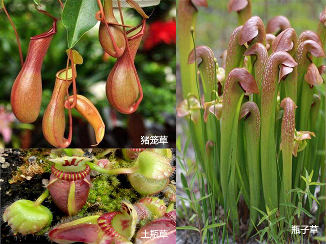 猪笼草、土瓶草和瓶子草虽然都是用瓶子捕食,但它们瓶子的结构完全不同。猪笼草的瓶子,瓶把儿是从瓶子底部伸出的。土瓶草的瓶子,瓶把儿是从瓶子后方伸出的。而瓶子草没有瓶把儿,瓶子直接从地面长出来。