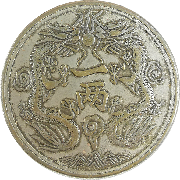 此枚光绪银币双龙一两,直径:45mm 重:37.6g 正面上有寿字,下面有抽象的蝙蝠,寓意福寿双全,左右两侧有两条龙,龙纹中分别写有丁未二字,中间正圈写有“光绪银币”四字。反面两龙龙面相对,龙首中夹一太阳(日),双龙中刻有一两二字,两字中无竖笔划,是双人形态,龙身左、右及下方各有一朵祥云图案,共3朵,下有5堆如高山般的浪花纹,无内齿及定位点。