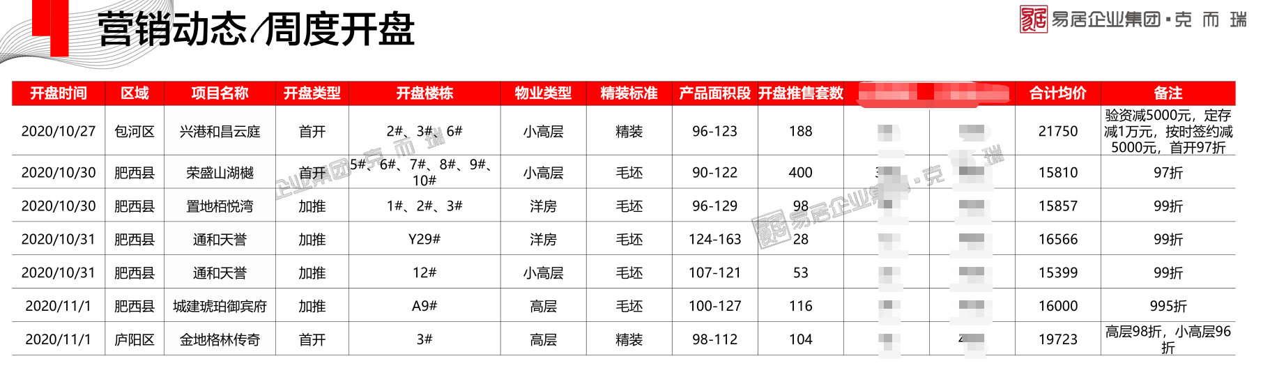 乐居买房讯(编辑 小杰)据克而瑞监测,合肥上周(10.26-11.1)共有6盘推新,1155套房源集中入市,其中肥西县4盘,庐阳1盘,包河1盘。其中庐阳区金地格林传奇与包河兴港和昌云庭首开引关注。