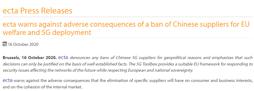 欧洲竞争电信协会(ECTA)此前也在其官方网站发表声明,谴责出于地缘政治原因对中国5G供应商实施任何禁令,警告此举将带来欧盟5G部署延迟等负面影响。声明指出,排除特定供应商将损害消费者及电信行业的利益,打击市场内部凝聚力。任何罔顾事实的政治决定,不仅将严重制约欧洲5G网络建设步伐和科技创新能力,还会对欧洲经济社会的复苏和发展带来广泛而深远的负面影响。