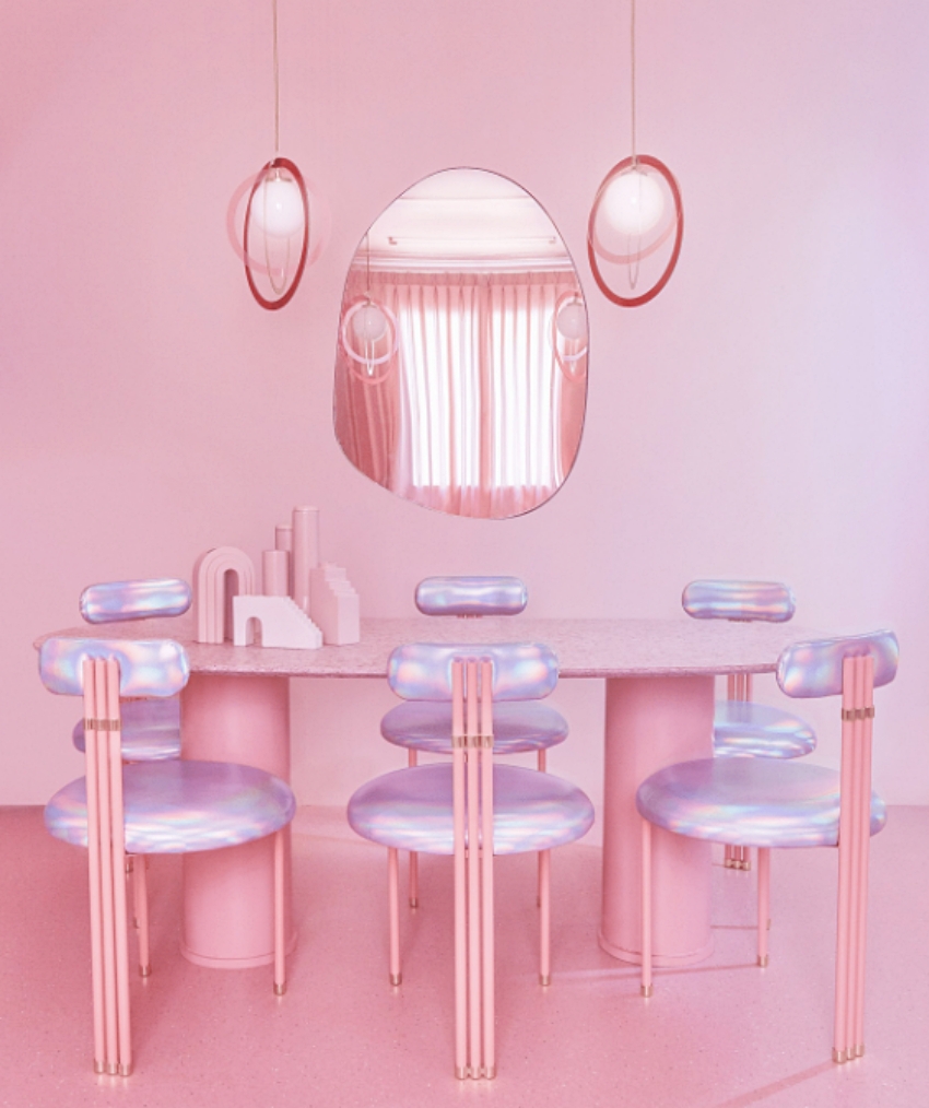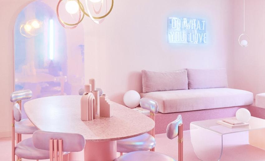 全室天、地、壁皆晕染柔嫩粉彩基底,团队遵循现代极简的表现手法,消弭同色系的沉闷压迫气息,例如采用水磨石坐榻、霓虹幻彩饰墙衬托不同质地表现,推展纯粹色调的立体层次。