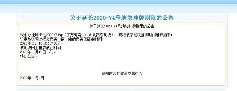 根据公告内容,该宗地块的挂牌期限将延长至2020年11月19日15时,也就是半个月之后了。