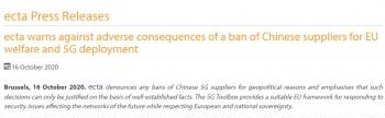 欧洲竞争电信协会(ECTA)此前也在其官方网站发表声明,谴责出于地缘政治原因对中国5G供应商实施任何禁令,警告此举将带来欧盟5G部署延迟等负面影响。声明指出,排除特定供应商将损害消费者及电信行业的利益,打击市场内部凝聚力。任何罔顾事实的政治决定,不仅将严重制约欧洲5G网络建设步伐和科技创新能力,还会对欧洲经济社会的复苏和发展带来广泛而深远的负面影响。