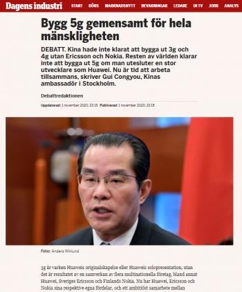 11月1日,中国驻瑞典大使桂从友在瑞典《今日工业报》发表题为《合作建5G造福全人类》的署名文章。正如大使在文章中所说,5G不是华为的独创,也不是华为的独唱,而是华为与瑞典爱立信、芬兰诺基亚等跨国公司合作的产物。先进的全球5G需要这些公司通力合作,把各自研发的最先进技术和设备拿出来,融合在一起。