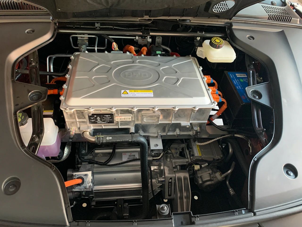 由于比亚迪汉EV车架以及部分结构件会做轻量化考虑,那它的被动碰撞的安全性就有必要警惕。打开比亚迪汉EV的前机盖,可以看到电控系统周围非常空。而装有电控系统的部分也采用铝合金(或者塑钢)做支架。