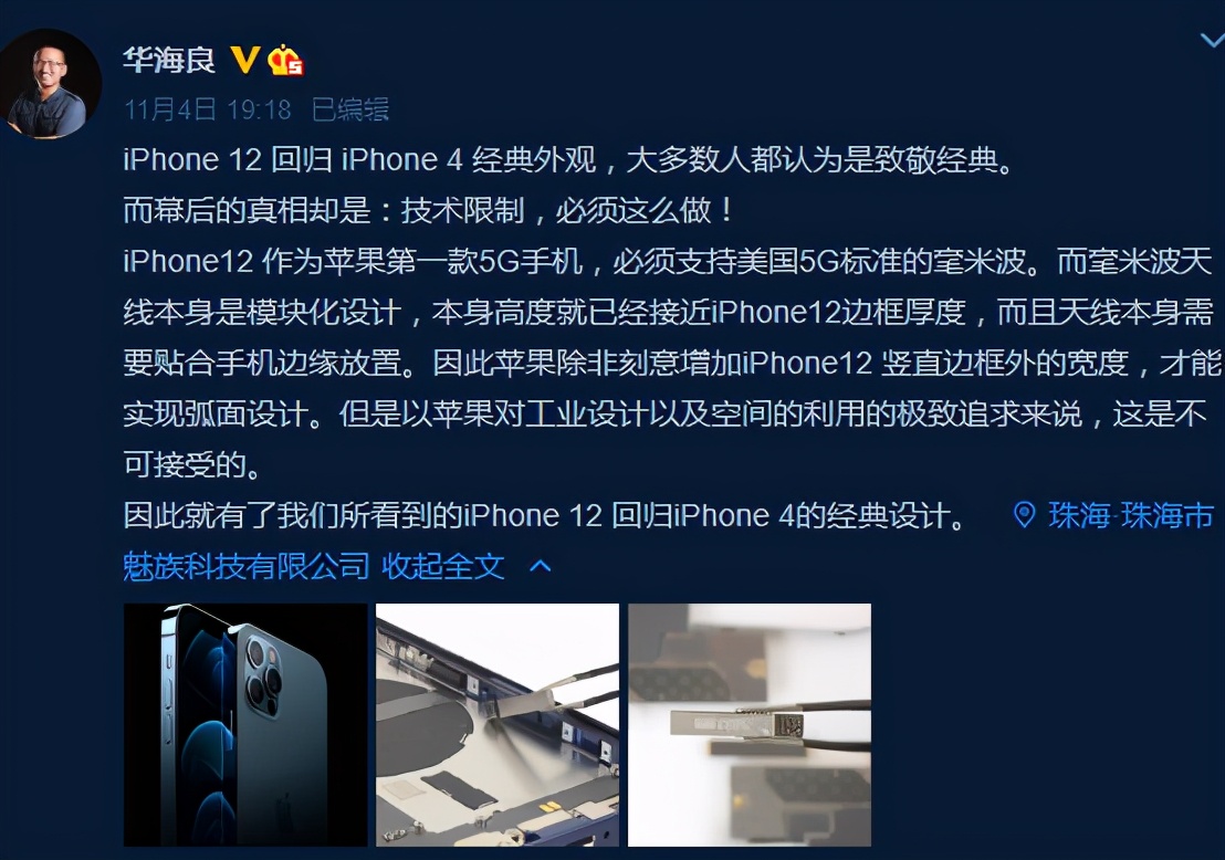 昨天晚些时候,魅族高管华海良给出了一个合理的答案。他表示很多人觉得iPhone 12回归iPhone 4边框是为了致敬经典,其实是因为技术所迫,必须这么做。