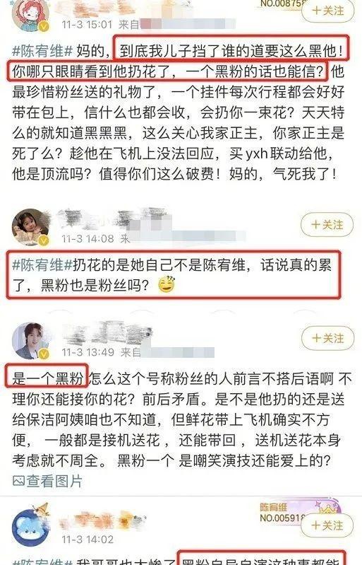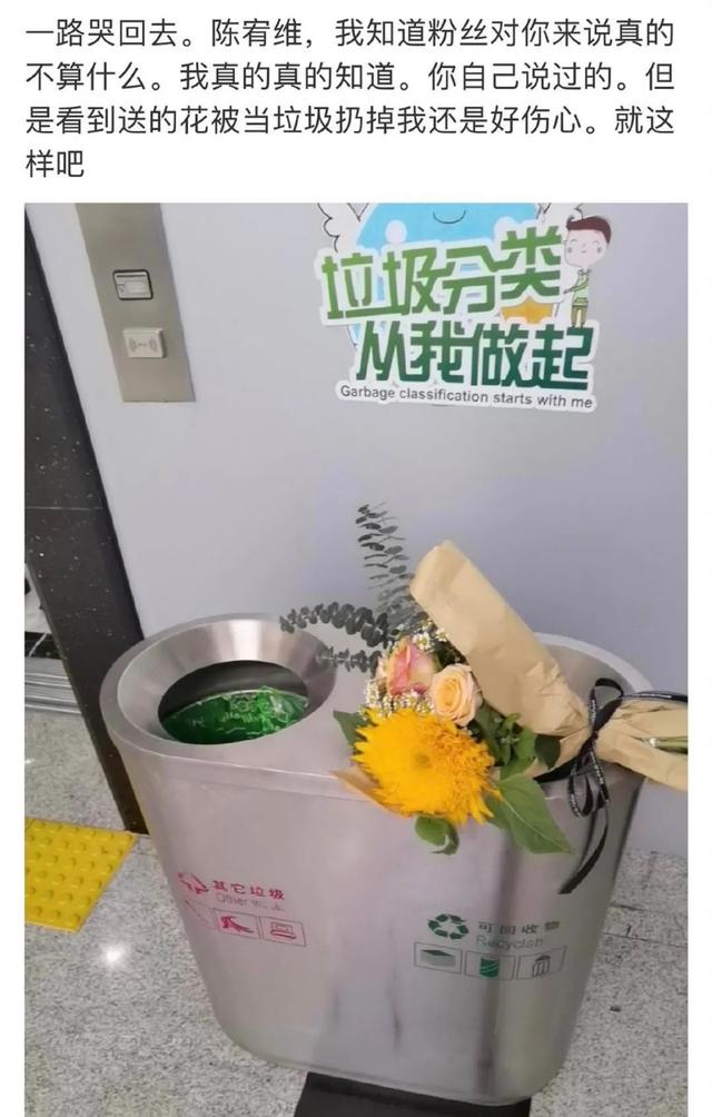 11月3日,“陈宥维扔粉丝花”事件在网络上发酵,有位自称是陈宥维的粉丝,在个人社交平台上哭诉,陈宥维把她送的花扔进了垃圾桶,自己知道后非常伤心,哭了一路。