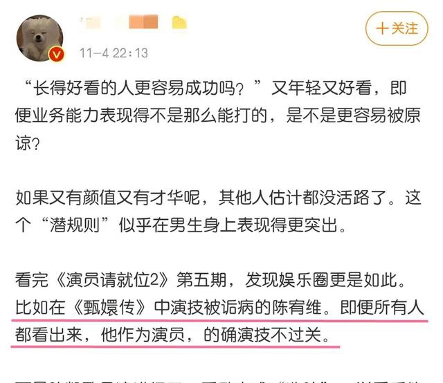 对此,部分网友坐不住了,有一位网友说:“难道长得好看的人更容易成功吗?所有人都能看出陈宥维演技的拙劣,为什么他还是能得到A卡,表现得更好的刘芮麟却得不到?”
