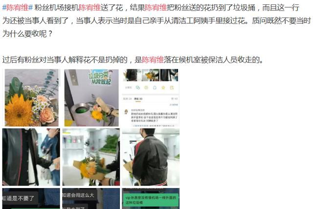 还有说法是,送花女生说,花不是陈宥维扔掉的,是因为带不走,就留在了机场,被保洁阿姨拿去处理。这位粉丝又从保洁那把花要回,然后自己扔了。