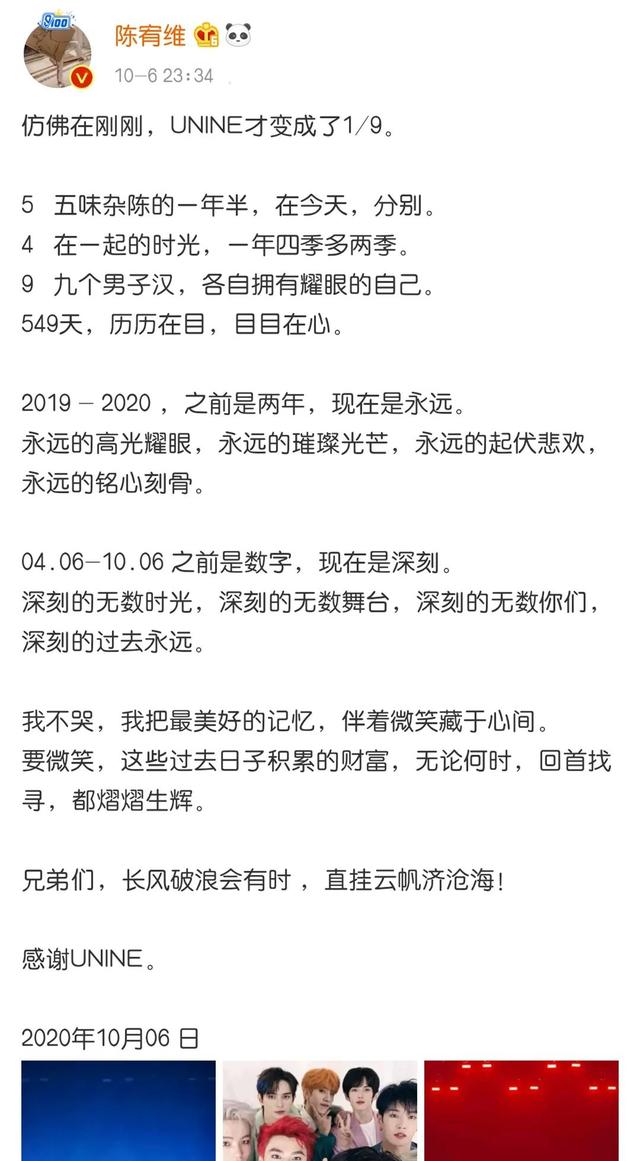 或许,陈宥维的内心,早就偏向了演员,所以他才会那么想摆脱偶像这个身份。但是陈宥维似乎有些太着急了,在《演员请就位2》录制期间,甚至是第一期播出时,陈宥维所属的UNINE组合还没有解散。