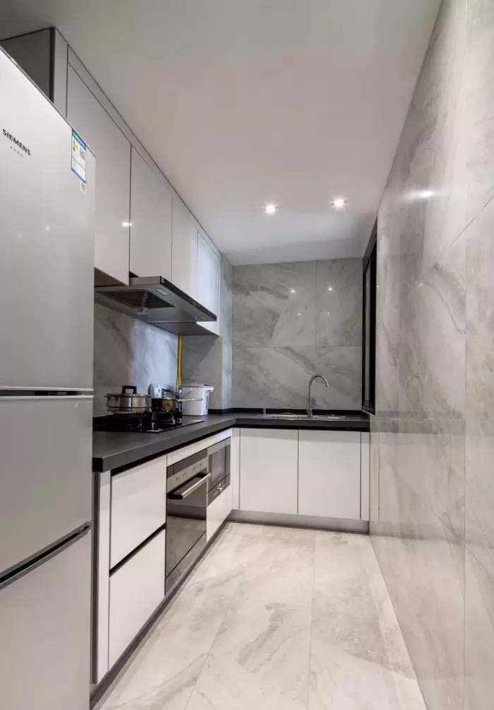 ▲厨房空间L型的橱柜布局,冰箱被摆放在柜子的边上。厨房的墙地面通铺大理石瓷砖,搭配白加黑的橱柜、台面,非常大气。