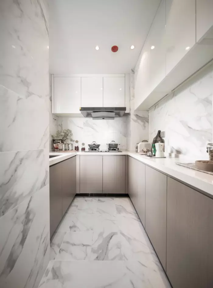 ▲厨房中雅白的墙面地面,布置U形操作台,让做饭空间也更加时尚舒适而自然。