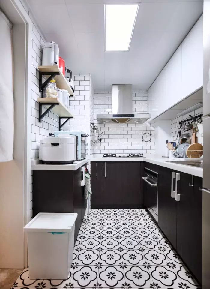 ▲厨房地面贴着梅花图案的地砖,结合上深色的橱柜,呈现出一个文艺时尚的空间感。丰富充足的操作台面积,还有恰到好处的收纳架,也为烹饪提供了方便。