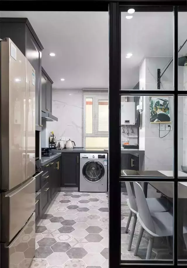 ▲餐厨和玄关之间用黑框玻璃门作为隔断,两个空间结合起来,让厨房橱柜也能多做上一些,冰箱、洗衣机等电器嵌入柜子当中,更显简洁。