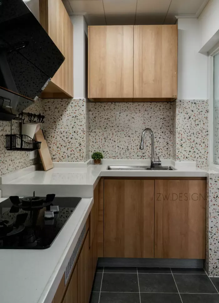 ▲厨房以灰色地砖+水磨石墙面+木色定制橱柜的设计,整体氛围充满现代年轻的文艺感。而操作台也是以高低台的组合,让做饭洗菜刷碗都有更舒适的体验。
