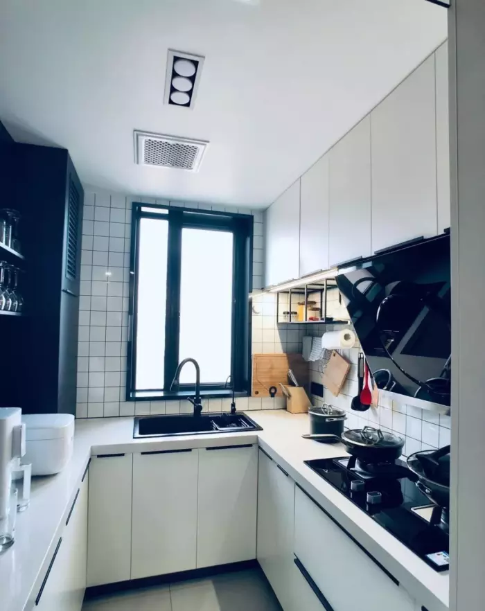 ▲U型的厨房布局,整体以黑白色为主,厨电大多都嵌入橱柜里,吊柜下和墙上都做了一些收纳,整个厨房打理的整齐干净。