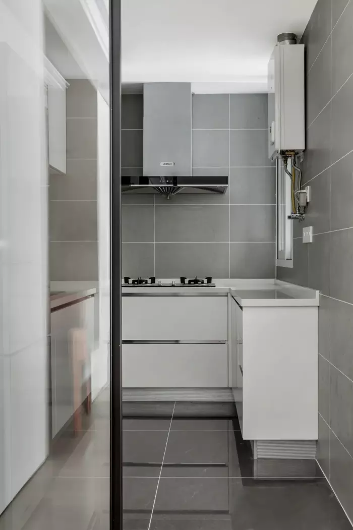 ▲厨房的墙面地面砖都是灰色的设计,搭配上白色橱柜,U型的操作台,根据厨房空间比较小的情况,右侧的台面宽度较小,作为临时操作台用也是足够的。