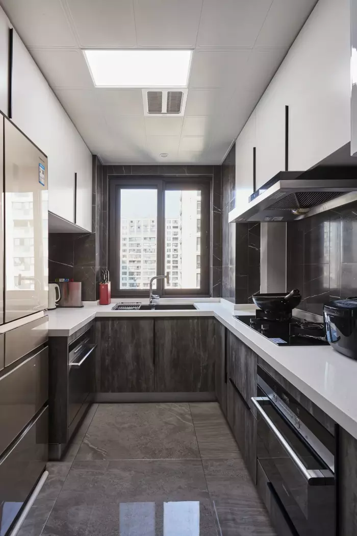 ▲厨房地面墙面都是灰色的基础,橱柜深灰色的木纹,而吊柜则是白色的设计,整体U字型的操作台设计,也让做饭烹饪氛围显得更加时尚而从容舒适。
