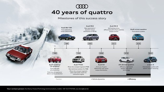 从诞生至今,已有近1100万辆搭载奥迪quattro技术的奥迪车售出。在过去的四十年里,奥迪quattro从最初的一款车,发展成一项顶尖的四驱技术,再进化为一个响亮的运动品牌,持续对奥迪品牌输入强劲的推动力量。