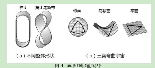 根据广义相对论的结论,在大质量天体附近,时空是弯曲的,那是时空的局部性质。广义相对论的应用也可以扩大到研究宇宙的整体形态。局部和整体的差别从图 4a 中的莫比乌斯带和平凡柱面的例子中一目了然。局部而言,两种情形都是“平坦”的,但两种几何形状的整体拓扑却迥然不同。图 4b 则给出了宇宙作为一个整体时的三种可能弯曲形态。