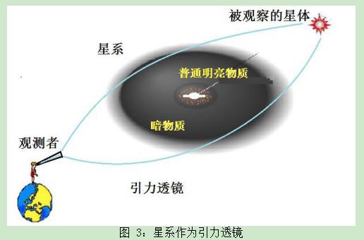暗物质的引力作用也符合广义相对论,因而能造成时空的弯曲。光线透过弯曲的时空后会偏转,类似于光线在透镜中的“折射”现象。根据这个原理,爱因斯坦最先提出了“引力透镜”的设想,因而有人将它们称为“爱因斯坦的望远镜”。兹威基在 1937 年曾经指出,有暗物质的星系团可以做为实现引力透镜的最好媒介。可想而知,由较为均匀分布散开在星系中的暗物质形成的透镜,肯定要比密集的星体形成的透镜“质量”好得多,见图 3。不过,直到 1979 年,这种引力透镜的效应才在天文观测中获得证实。