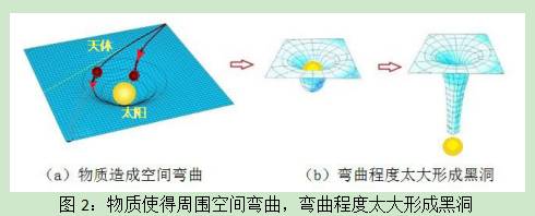 试想一下,如果橡皮筋网上铅球的重量增加,网格的弯曲变形程度也会增加,如果铅球太重了,橡皮筋网可能被撑破,形成一个洞,小球掉入洞中再也捡不起来,这在引力场的情形,便相当于引力塌缩形成黑洞,如图 2b 所示。