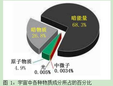 图 1 所示的是 2013 年普朗克卫星给出的数据,在我们观测所及的宇宙中,人类有所认识的通常物质,包括由原子分子构成的物质、光波、中微子、各种介子等在内,大约只占