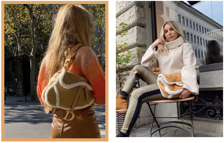 除了纯毛绒的款式,皮毛拼接包也是很好的选择。温柔的浅驼色拼接奶油色毛绒边缘,像是甜蜜的奶油饼干,超级治愈!再搭配一件秋冬色系的毛衣,充满了复古调调,瞬间就能感受到扑面而来的秋冬气息~
