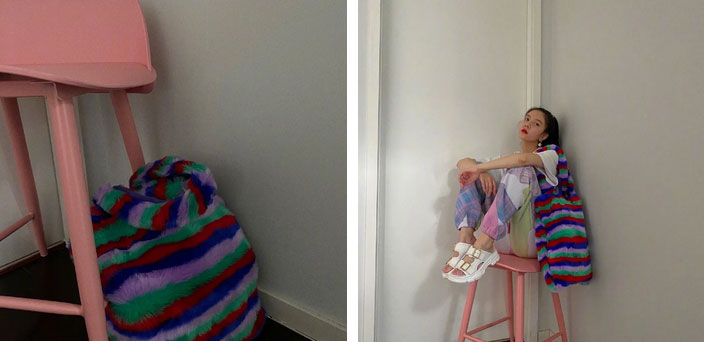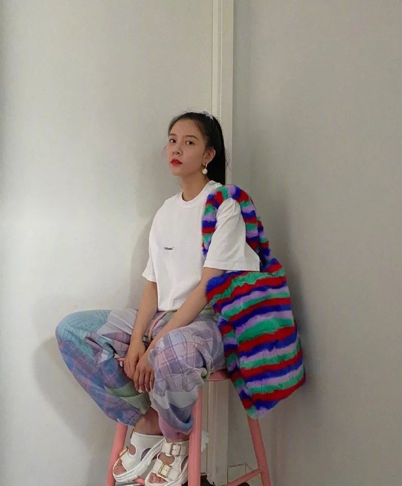 CC宋妍霏就选择了一只oversize的彩色毛绒托特包,红绿蓝紫的撞色设计,色彩饱和度十足,搭配简单的白T和格纹裤,成为造型的点睛之笔。