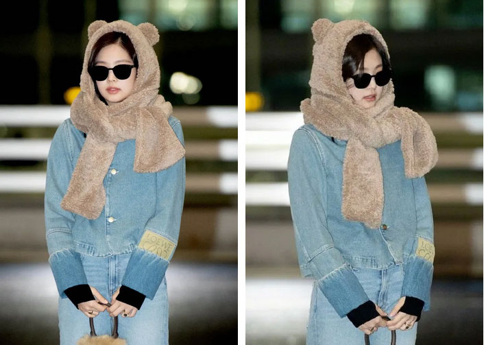 去年年底Jennie穿着一身牛仔套装,头戴毛绒小熊围巾帽出现在机场的造型大家都还有印象吧!软萌甜美妮,保暖和可爱兼具!瞬间某橙色软件的搜索关键词就出现了各种同款~