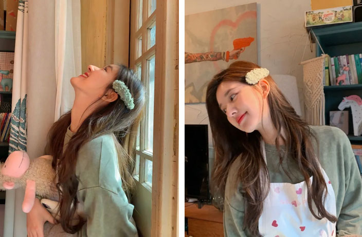 发卡同样也可以和毛绒搭配,同色系的牛油果绿色卫衣和夹在侧边超大号毛绒发卡,韩系甜美露思get!