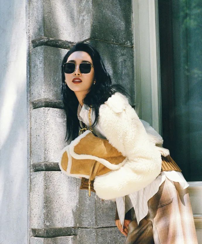 王紫璇则选择甜美和气质兼具的皮毛拼接款包包,白色毛绒和咖色针织拼接的外套和格纹长裤搭配,再拿一只皮毛拼接的包包,色系上互相呼应,映衬着秋季的阳光温暖灿烂。