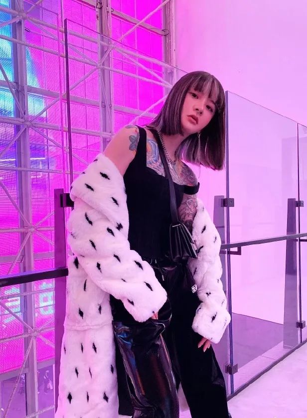 造型师小白则选择了酷感十足的黑白两色穿搭,白底黑色波点的长款毛绒外套内搭黑色背心和皮裤,顺色系的内搭更加凸显线条,减少了白色毛绒的膨胀感,不愧是时尚sense永远在线的小白。