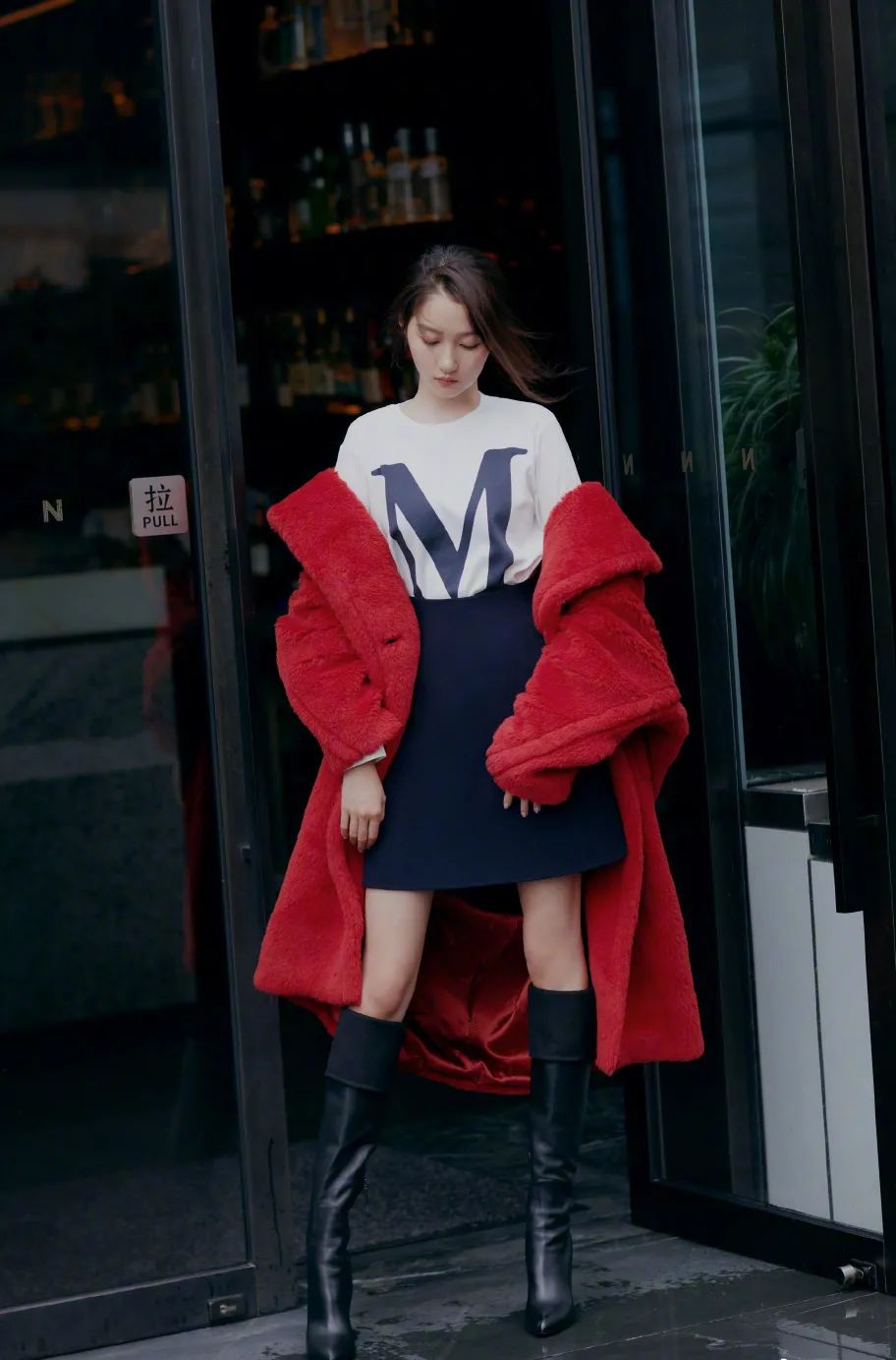 我们的“在逃格格”关晓彤就选择了一件大红色的长款毛绒外套,内搭简单的白色印花T和半身短裙,高跟的膝下长靴更是拉长腿部比例,霸气十足又不失女人味。集美们可以在春节的时候get同款穿搭,准不会出错~
