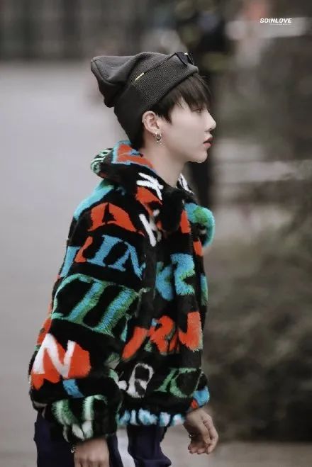 除了纯色款,换成刘雨昕身上黑底彩色字母印花的毛绒短外套,就一秒切换成了酷炫的街头风。同样是翻领的设计,收缩的袖口和下摆更强调了边界感,毛线帽和墨镜搭配,swag满满。